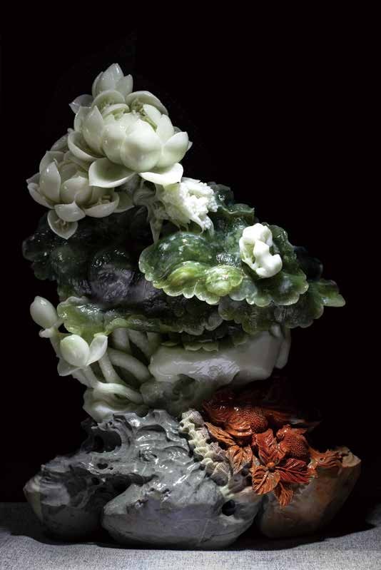 作品运用浮雕镂雕结合巧色技法,以荷花为主题材。荷花在中国玉雕中的寓意是和和美美,一品清濂; 荷叶与金蟾寓意富贵生财。作品代表着和和美美,财源广进,连年有余。
