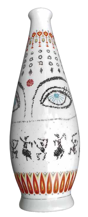 作品以瓷质汾酒空酒瓶为材料,以广大医务工作者逆向而行的身影为创意题材。图案采用手工雕刻制作完成,利用纺锤形的形状和原有的色彩,构思出一位美丽少女的头部形象,突出了眼睛和带着口罩面部,反映了她的心灵美。