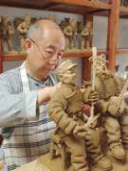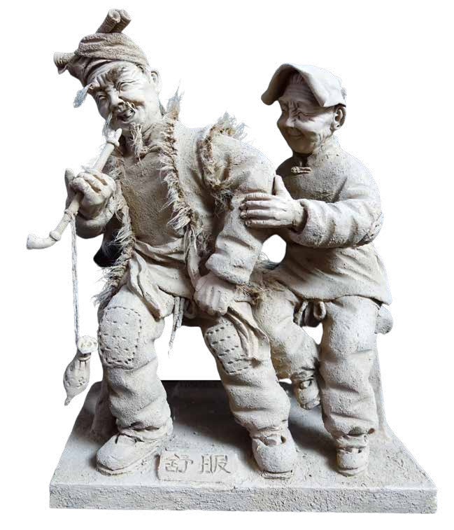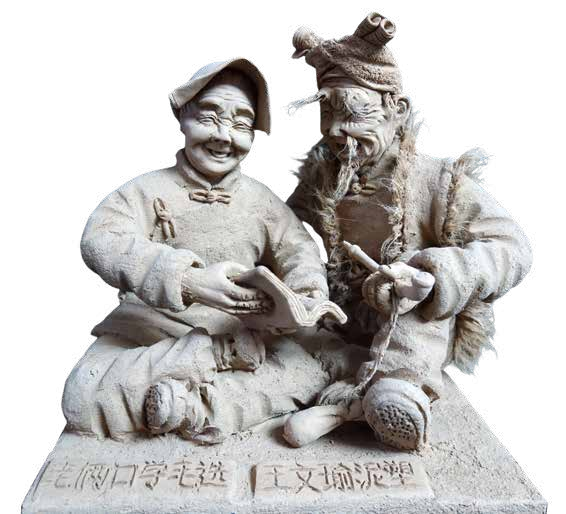 作品选用陕北黄土泥,经过十几道工序纯手工捏塑出老农民夫妇认真学习《毛泽东选集》的场景。