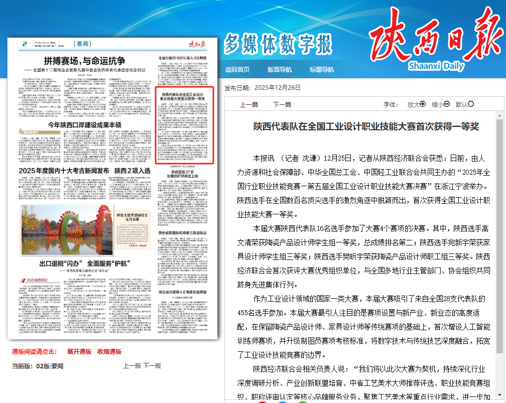 12月26日,《陕西日报》02版要闻栏目刊发文章《陕西代表队在全国工业设计职业技能大赛首次获得一等奖》,报道陕西经济联合会组织代表队参加全国工业设计职业技能大赛并取得佳绩。